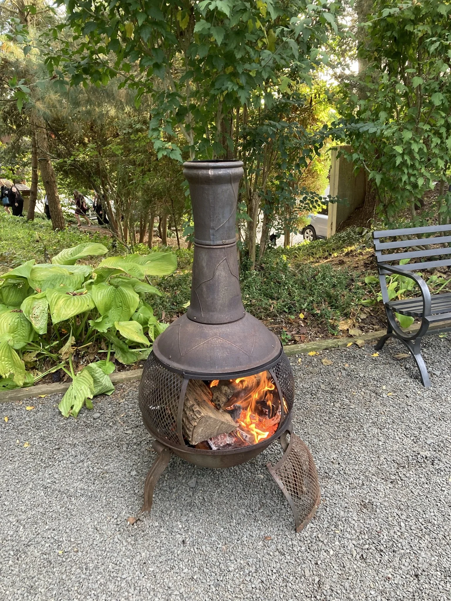 When it’s cold, we start a roaring fire in our chiminea by the Koi Pond for garden cocktails.